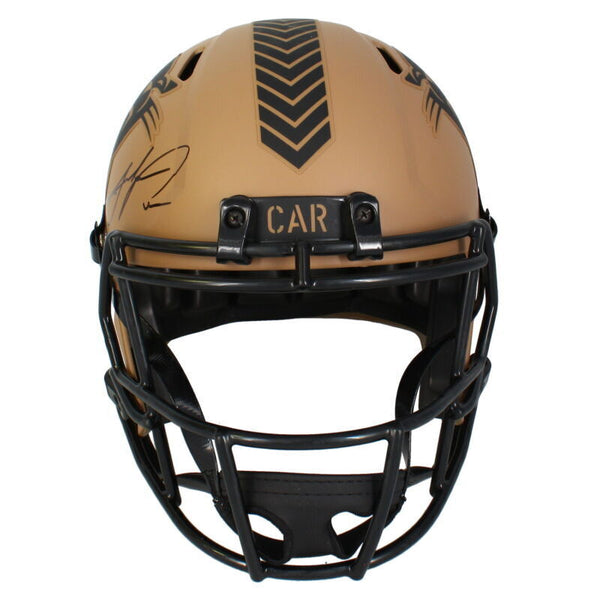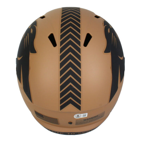 This Carolina Panthers Salute to Service full size replica Riddell Speed helmet has been personally hand-signed by Julius Peppers. It comes with an individually numbered, tamper-evident hologram from Beckett Authentic. To ensure authenticity, the hologram can be reviewed online. This process helps to ensure that the product purchased is authentic and eliminates any possibility of duplication or fraud.