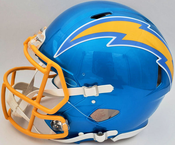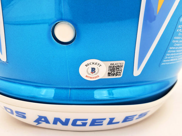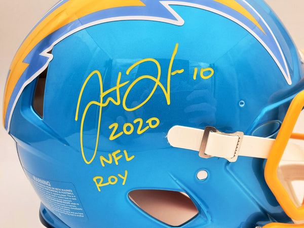 This is a Los Angeles Chargers Flash Blue Full Size Authentic Speed Helmet that has been hand signed by Justin Herbert. The Flash helmets are very delicate and often have some marks or scratches on them. This item was inscribed "2020 NFL ROY." This item has been certified authentic by Beckett Authentication (BAS) and comes with their tamper-proof QR Code sticker that can be verified on the Beckett-authentication.com.