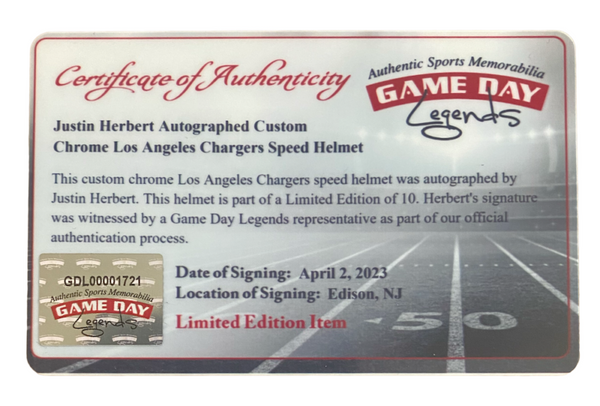 This Los Angeles Chargers authentic Riddell Chromed Speed helmet has been personally hand-signed by Justin Herbert. This helmet includes chrome inlay. It has all the bells and whistles. It comes with an individually numbered, tamper-evident hologram from Beckett Authentic as well as Super Sports Center. Also included is the GDL Certificate of Authenticity. To ensure authenticity, the hologram can be reviewed online. This process helps to ensure that the product purchased is authentic and eliminates any possibility of duplication or fraud.This helmet is limited to just 10 and you are bidding on number "1" from the edition.