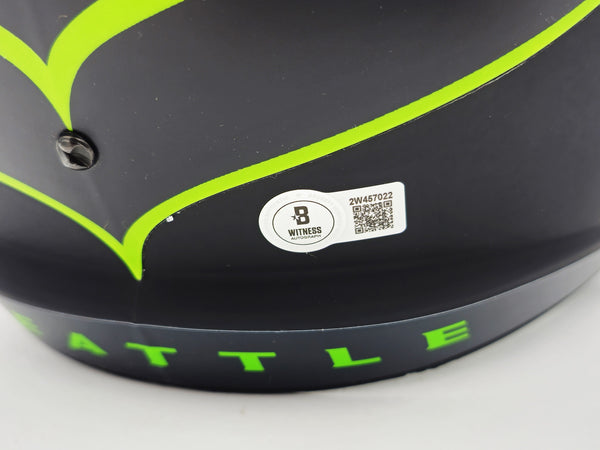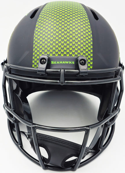 This is a Seattle Seahawks Eclipse Black Full Size Speed Replica Helmet that has been hand signed by Kenneth Walker III. The Eclipse helmets are delicate and may have some marks or scratches on them. This item has been witnessed and certified authentic by Beckett Authentication (BAS) and comes with their tamper-proof witness hologram.