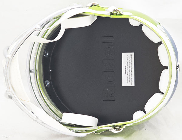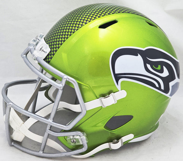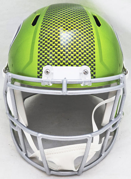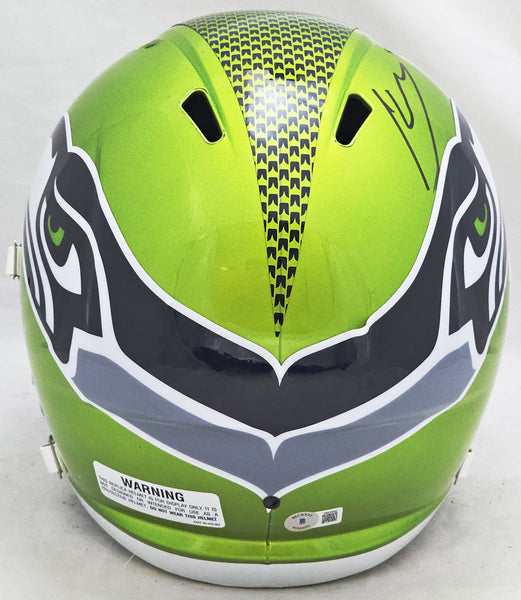This is a Seattle Seahawks Flash Green Full Size Replica Speed Helmet that has been hand signed by Kenneth Walker III. The Flash helmets are delicate and may have some marks or scratches on them. This item has been witnessed and certified authentic by Beckett Authentication (BAS) and comes with their tamper-proof witness sticker.