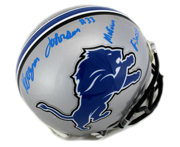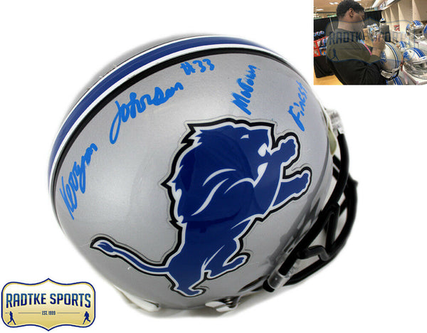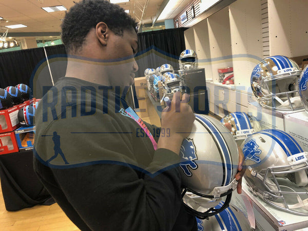 A Detroit Lions Riddell Throwback Authentic Helmet hand signed by Kerryon Johnson. The item and signature are in excellent condition. In addition to signing his name, Kerryon inscribed "Motown Finest" on the item. Kerryon was 2017 SEC Player of the Year, 2017 First-Team, and 2017 SEC Offensive Player of the Year. All-SEC. AUTHENTICATION: The item is accompanied by a Kerryon Johnson/Radtke Certificate of Authenticity, Kerryon Johnson/Radtke Matching Databased Holograms, Picture of Kerryon from the Signing