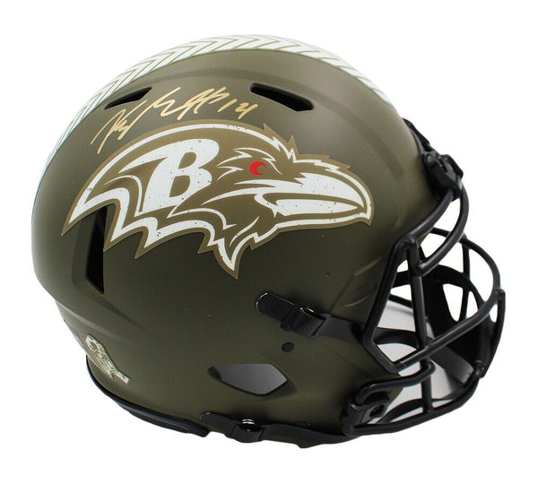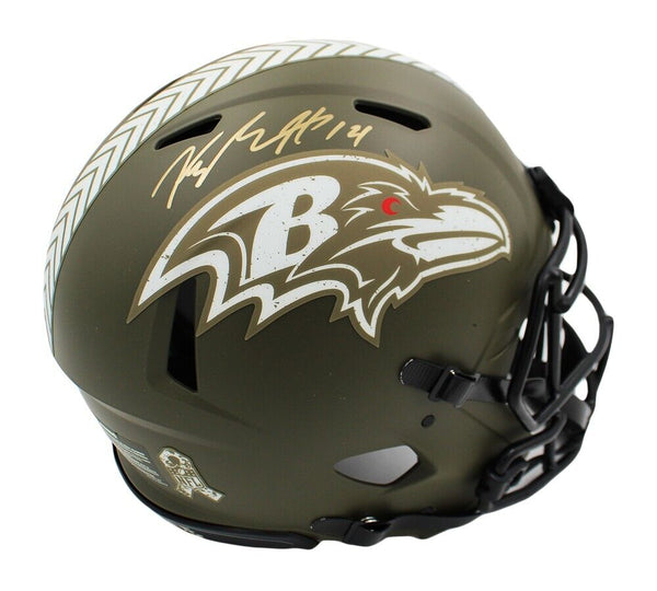 A Baltimore Ravens Speed Authentic Salute to Service NFL Helmet hand signed by Kyle Hamilton. The item and signature are in excellent condition. Kyle is a football safety. He played for Notre Dame in college. He drafted into the NFL by the Baltimore Ravens in 2022. AUTHENTICATION: Your item has been tagged with a SmarTag powered by Prova technology, which gives you digital access to your items authentication records, including a proof picture from the signing.