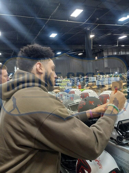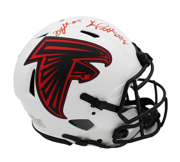 An Atlanta Falcons Speed Authentic Lunar NFL Helmet hand signed by Drake London and Kyle Pitts. The item and signature are in excellent condition. Drake is a football wide receiver for the Atlanta Falcons drafted in 2022. Kyle was drafted into the NFL in 2021 Round 1, he was awarded the John Mackey Award (2020) and was Unanimous All-American (2020). AUTHENTICATION: Your item is tagged with a SmarTag powered by Prova Technology, which gives you digital access to your items authentication records.