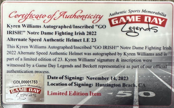 This Notre Dame Fighting Irish aAlternate uthentic speed helmet has been personally hand-signed by Super Sports Center exclusive athlete, Kyren Williams. Kyren added the inscription "Go Irish." It comes with an individually numbered, tamper-evident hologram from Beckett Authentic. To ensure authenticity, the hologram can be reviewed online. This process helps to ensure that the product purchased is authentic and eliminates any possibility of duplication or fraud. Also included is the Super Sports Center tamper-evident hologram and Certificate of Authenticity.This helmet is limited to just 23 and you are bidding on number "1" from the edition. Kyren Williams is the newest exclusive athlete to the Super Sports Center family.