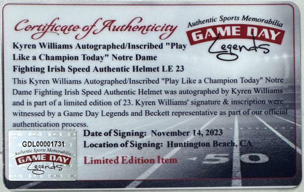 This Notre Dame Fighting Irish authentic speed helmet has been personally hand-signed by Super Sports Center exclusive athlete, Kyren Williams. Kyren added the inscription "Play Like A Champion Today." It comes with an individually numbered, tamper-evident hologram from Beckett Authentic. To ensure authenticity, the hologram can be reviewed online. This process helps to ensure that the product purchased is authentic and eliminates any possibility of duplication or fraud. Also included is the Super Sports Center tamper-evident hologram and Certificate of Authenticity.This helmet is limited to just 23 and you are bidding on number "1" from the edition. Kyren Williams is the newest exclusive athlete to the Super Sports Center family.