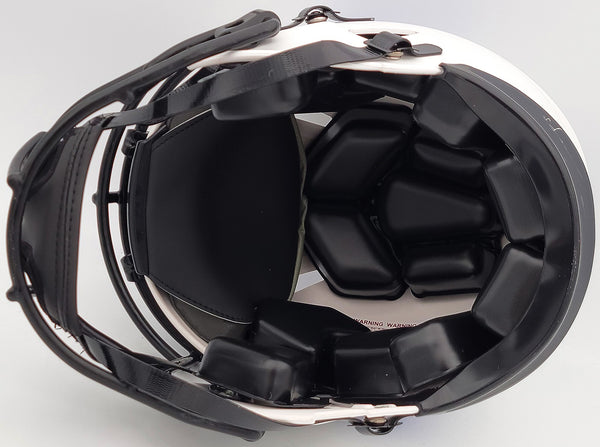 This is a New York Giants Lunar Eclipse White Full Size Authentic Speed Helmet that has been hand signed by Lawrence Taylor & Saquon Barkley. The Eclipse helmets are delicate and often have some marks or scratches on them. Taylor inscribed this item "81 NFL ROY." Barkley inscribed this item "2018 NFL ROY." This item has been certified authentic by Beckett Authentication (BAS) and comes with their tamper-proof QR Code hologram.