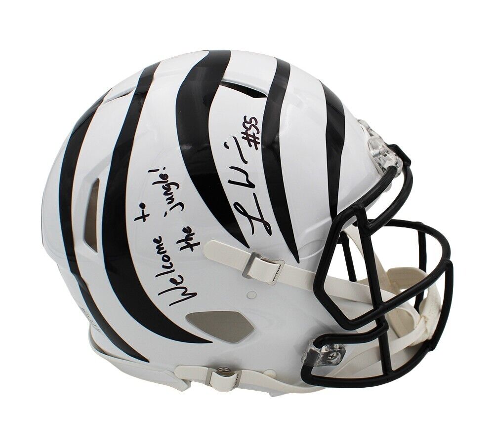 A Cincinnati Bengals Speed Authentic Alternate NFL Helmet hand signed by Logan Wilson. The item and signature are in excellent condition. In addition to signing his name, Logan also inscribed "Welcome to the Jungle" on the item. Logan is a football linebacker who played college football for Wyoming. He was drafted into the NFL by the Cincinnati Bengals in 2020. AUTHENTICATION: Your item is tagged with a Beckett Serial Numbered and Databased Hologram