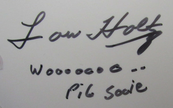Lou Holtz Signed/Inscribed "Woooo - Pig Sooie" University of Arkansas Full Size White Matte Replica Football Helmet. This helmet is authenticated by JSA and contains their Tamper-proof Sticker and Certificate of Authenticity.