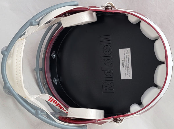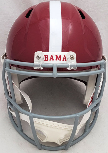 This is an Alabama Crimson Tide Red Full Size Replica Speed Helmet that has been hand signed by Mac Jones. This item has been witnessed and certified authentic by Beckett Authentication (BAS) and comes with their tamper-proof witness sticker. Beckett Authentication has recently changed their physical certificate card policy where they no longer match their tamper-proof sticker with a physical certificate. The tamper-proof sticker holds the value in the authentication process while the certificate does not. A certificate can be printed on Beckett's website for the matching authentication number.