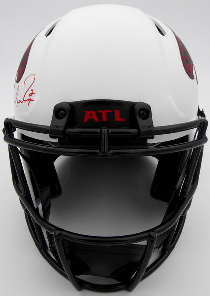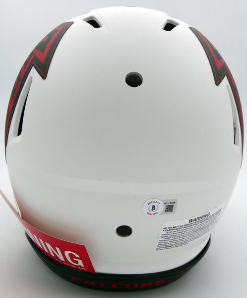 This is an Atlanta Falcons Lunar Eclipse White Full Size Authentic Speed Helmet that has been hand signed by Matt Ryan. The Eclipse helmets are very delicate and often have some marks or scratches on them. This item has been certified authentic by Beckett Authentication (BAS) and comes with their tamper-proof QR Code sticker that can be verified on the Beckett-authentication.com.