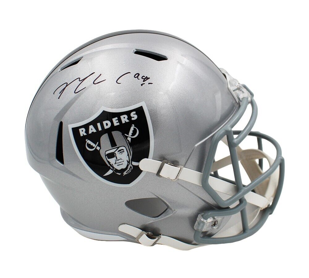 A Las Vegas Raiders Speed Full Size NFL Helmet hand signed by Maxx Crosby. The item and signature are in excellent condition. Maxx was drafted into the NFL in 2019. He is Pro Bowler (2021)& 2x First-team All-MAC (2017,2018). AUTHENTICATION: The item is accompanied by a Fanatics Authentic Serial Numbered and Databased Hologram