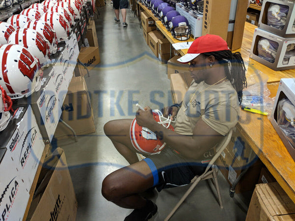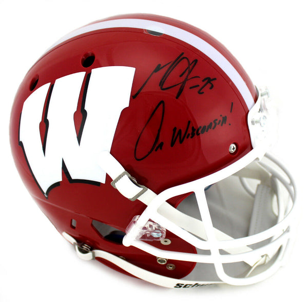 A Wisconsin Badgers Schutt Full Size Replica NCAA Red & White Helmet Hand Signed By Melvin Gordon. The Signature and item are in excellent condition. In addition to signing his name Melvin also inscribed "On Wisconsin" on the item. AUTHENTICATION: The item is accompanied by a Melvin Gordon Exclusive Certificate of Authenticity - Serial Numbered and Databased Hologram - Picture of Melvin from the signing.