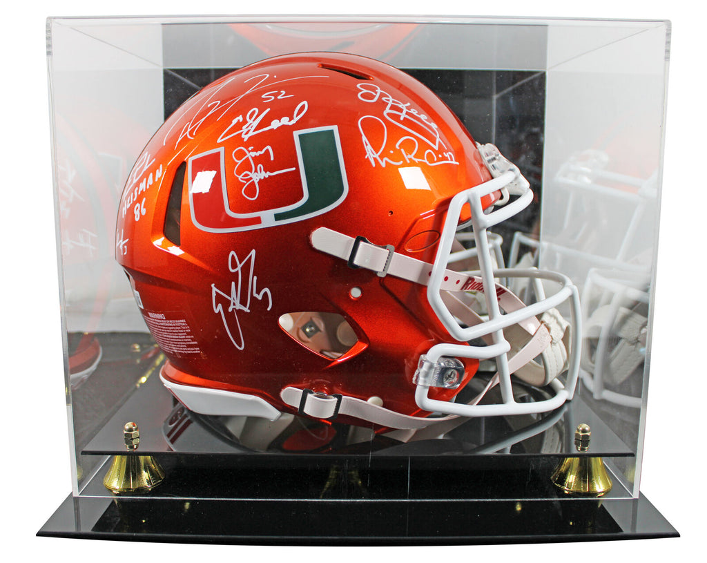 This Autographed Alternate Flash Riddell Full Size Speed Proline Helmet W/ Uv Mirrored Back Acrylic Display Case with the inscription of "HT 86 (Testaverde)" has been Personally Signed by Ray Lewis, Michael Irvin, Jim Kelly, Edgerrin James, Jimmy Johnson, Frank Gore, Ed Reed & Vinny Testaverde of the Miami Hurricanes. This item is 100% Authentic to include a hologram by Beckett Authentication Services. This item will come with an affixed Beckett Authentication Services (BAS) authentication sticker, which includes a scannable QR code to verify authenticity. Please note that Beckett no longer provides serial-numbered COA cards, and the attached BAS sticker will serve as the complete authentication for this item. This is a BAS Witnessed Protection Program item which means a Beckett Authentication Service representative was present when this item was being signed. We conducted an autograph signing with Ray Lewis, Michael Irvin, Jim Kelly, Edgerrin James, Jimmy Johnson, Frank Gore, Ed Reed & Vinny Testaverde where multiples of the same item were signed. While the photographs are representative of this item, the size, placement and strength of the signature may vary. Each item is hand signed, therefore, each autograph is unique. This item can be verified through BAS Witnessed.