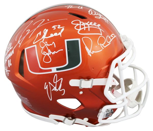 This Autographed Alternate Flash Riddell Full Size Speed Proline Helmet W/ Uv Mirrored Back Acrylic Display Case with the inscription of "HT 86 (Testaverde), All About the U! (Sapp)" has been Personally Signed by Ray Lewis, Michael Irvin, Jim Kelly, Edgerrin James, Jimmy Johnson, Frank Gore, Ed Reed, Warren Sapp & Vinny Testaverde of the Miami Hurricanes. This item is 100% Authentic to include a hologram by Beckett Authentication Services. This item will come with an affixed Beckett Authentication Services (BAS) authentication sticker, which includes a scannable QR code to verify authenticity. Please note that Beckett no longer provides serial-numbered COA cards, and the attached BAS sticker will serve as the complete authentication for this item. This is a BAS Witnessed Protection Program item which means a Beckett Authentication Service representative was present when this item was being signed. We conducted an autograph signing with Ray Lewis, Michael Irvin, Jim Kelly, Edgerrin James, Jimmy Johnson, Frank Gore, Ed Reed, Warren Sapp & Vinny Testaverde where multiples of the same item were signed. While the photographs are representative of this item, the size, placement and strength of the signature may vary. Each item is hand signed, therefore, each autograph is unique. This item can be verified through BAS Witnessed.