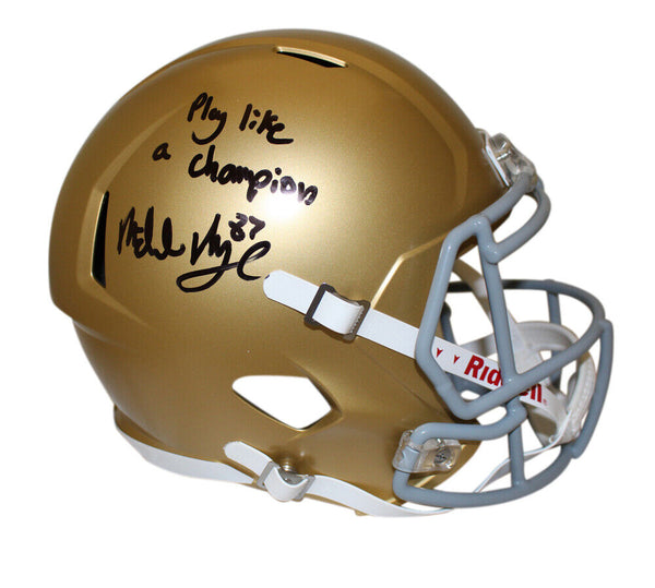 Michael Mayer Signed Notre Dame Fighting Irish F/S Speed Helmet Beckett 39137 The number in the listing title is just an inventory sku for our records and is not the authentication number. The item pictured is a stock photo unless otherwise noted. This is a Notre Dame Fighting Irish full size speed replica helmet that was personally autographed by Michael Mayer with Play Like a Champion inscription. Includes a certificate of authenticity from Beckett Authentication Services (BAS) and Denver Autographs.