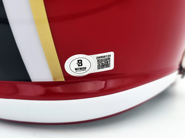 This is an Atlanta Falcons 1966-69 Throwback Red Full Size Speed Replica Helmet that has been hand signed by Michael Penix Jr. This item has been witnessed and certified authentic by Beckett Authentication (BAS) and comes with their tamper-proof witness hologram.