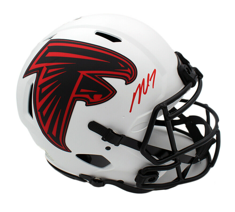An Atlanta Falcons Speed Authentic Lunar NFL Helmet hand signed by Michael Vick. The item and signature are in excellent condition. Michael is a former professional football quarterback who played 13 seasons in the NFL, primarily with the Atlanta Falcons and the Philadelphia Eagles. He played college football at Virginia Tech and was selected by the Falcons as the first overall pick in the 2001 NFL Draft. He is a 4x Pro Bowler, NFL Comeback Player of the Year and a Heisman Trophy finalist. AUTHENTICATION: The item is accompanied by a Beckett Certificate of Authenticity - Beckett Serial Numbered and Databased Hologram