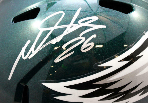 Miles Sanders Autographed Eagles Full Size Speed Helmet - JSA W Auth *Silver This is a hand autograph of Miles Sanders of the Philadelphia Eagles on a Riddell Football Full Size Speed Replica Helmet. This item has a James Spence Witness Protection Authentication, which comes with a numbered sticker and a matching JSA Certificate of Authenticity. You can view this item on the SpenceLOA website, it shows when and where the item was signed. It was signed either at a public autograph appearance or a private signing. This is a stock photo of the item. Although you may not receive this exact item, the item you receive is virtually identical and brand new in great shape.