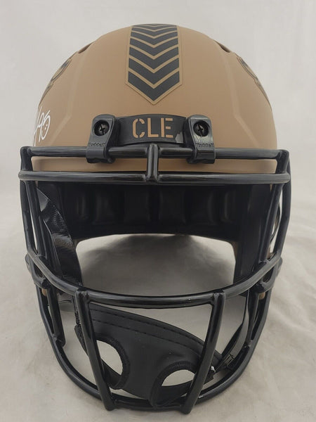 MYLES GARRETT AUTOGRAPHED CLEVELAND BROWNS FULL SIZE SALUTE TO SERVICE (STS 2) SPEED REPLICA HELMET WITH BECKETT QR CODE HOLOGRAM COATHIS MEANS THE HELMET WAS SIGNED WITH A BECKETT REPRESENTATIVE PRESENT SO YOU CAN BE 100% CERTAIN ITS THE REAL THING.