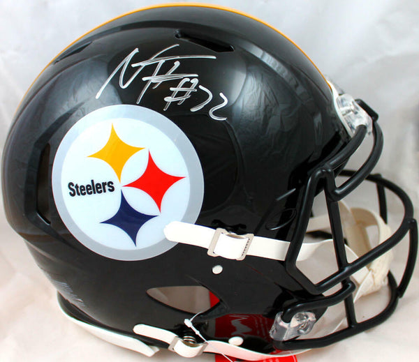 Najee Harris Autographed Pittsburgh Steelers F/S Speed Authentic Helmet-Fanatics *Silver This is a Najee Harris of the Pittsburgh Steelers hand autographed Riddell football full size speed Authentic helmet. This item has a Fanatics Authentication, which comes with a numbered sticker hologram and a QR code for verification. You can view this item on the Fanatics Authentication website and it shows when and where the item was signed. It was signed either at a public autograph appearance or a private signing. This is a stock photo of the item. Although you may not receive this exact item, the item you receive is virtually identical, brand new, and in great shape.