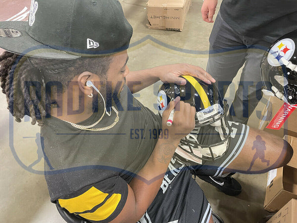 A Pittsburgh Steelers Speed Authentic Flash NFL Helmet hand signed by Najee Harris. The item and signature are in excellent condition. Najee was drafted in the 2021 NFL Draft by the Pittsburgh Steelers. He attended Alabama University were he was SEC Championship Game MVP. AUTHENTICATION: The item is accompanied by a Certificate of Authenticity - Fanatics Authentic & Serial Numbered and Databased Hologram
