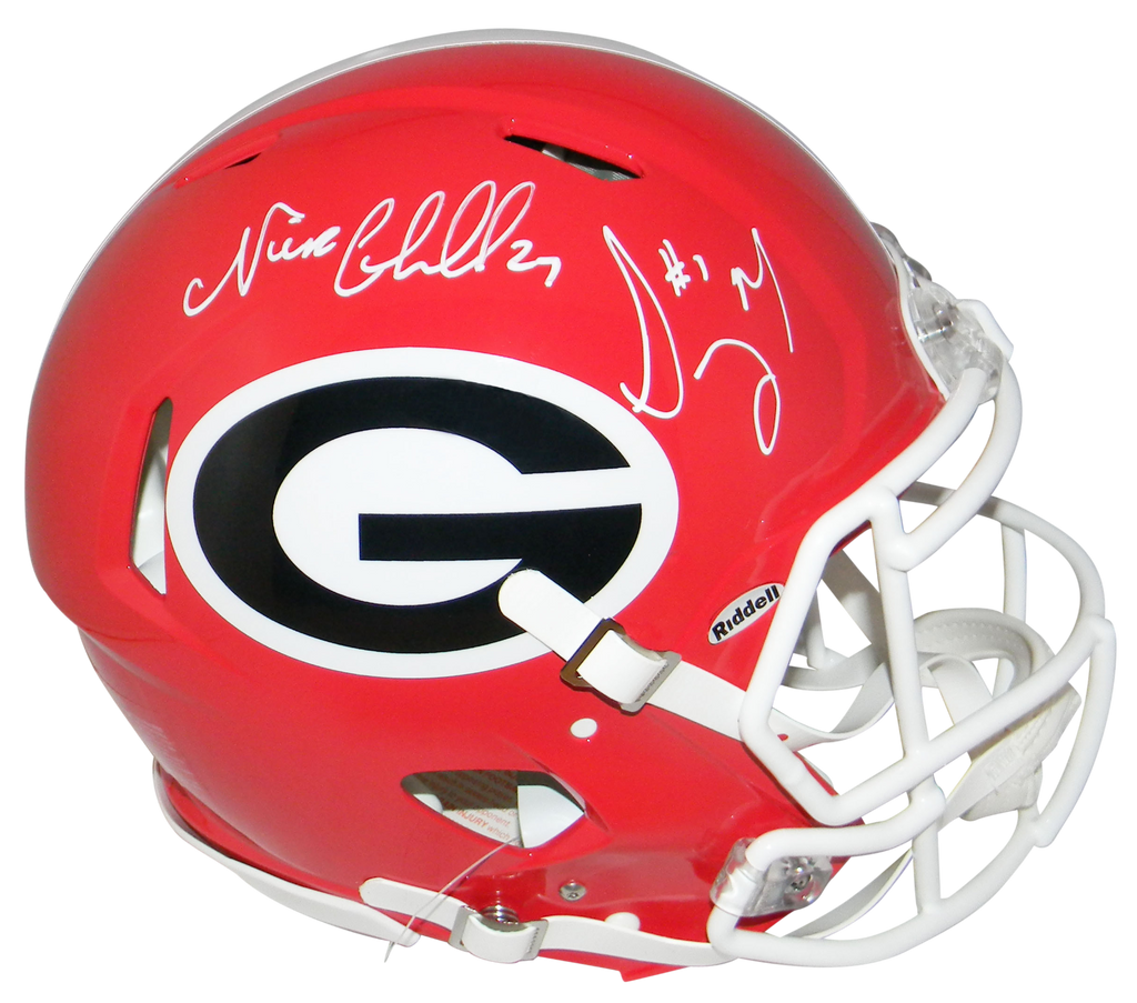 Nick Chubb and Sony Michel, former star running backs for the Bulldogs, have each hand signed this Georgia Riddell Speed full-size authentic helmet at a private signing. This helmet is fully padded inside like the ones worn on the field. This item comes with a certificate of authenticity (COA) from Beckett Authentication Services and was signed in the presence of one of their representatives. You will receive a serial-numbered COA along with a matching serial-numbered sticker on the helmet. The authenticity can be verified online by entering the serial number.Item pictured may not be the exact item you will receive. It will be similar quality, and we guarantee your satisfaction.