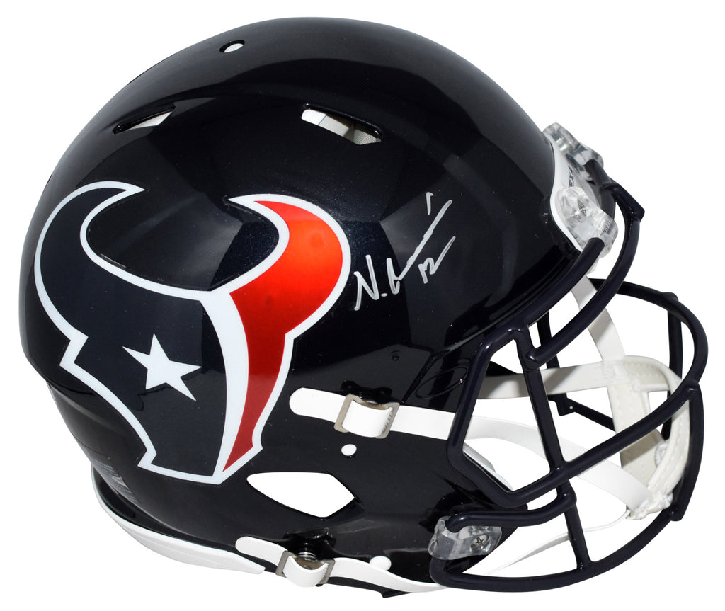 Nico Collins, star wide receiver for the Houston Texans, has hand signed this Texans Riddell Speed full-size authentic helmet at a private signing. This helmet is fully padded inside like the ones worn on the field. This item is authenticated by Beckett Authentication Services and was signed in the presence of one of their representatives. Their tamper-evident hologram featuring a QR code and serial number is on the item. The authenticity can be verified online by entering the serial number or scanning the QR code.Item pictured may not be the exact item you will receive. It will be similar quality, and we guarantee your satisfaction.