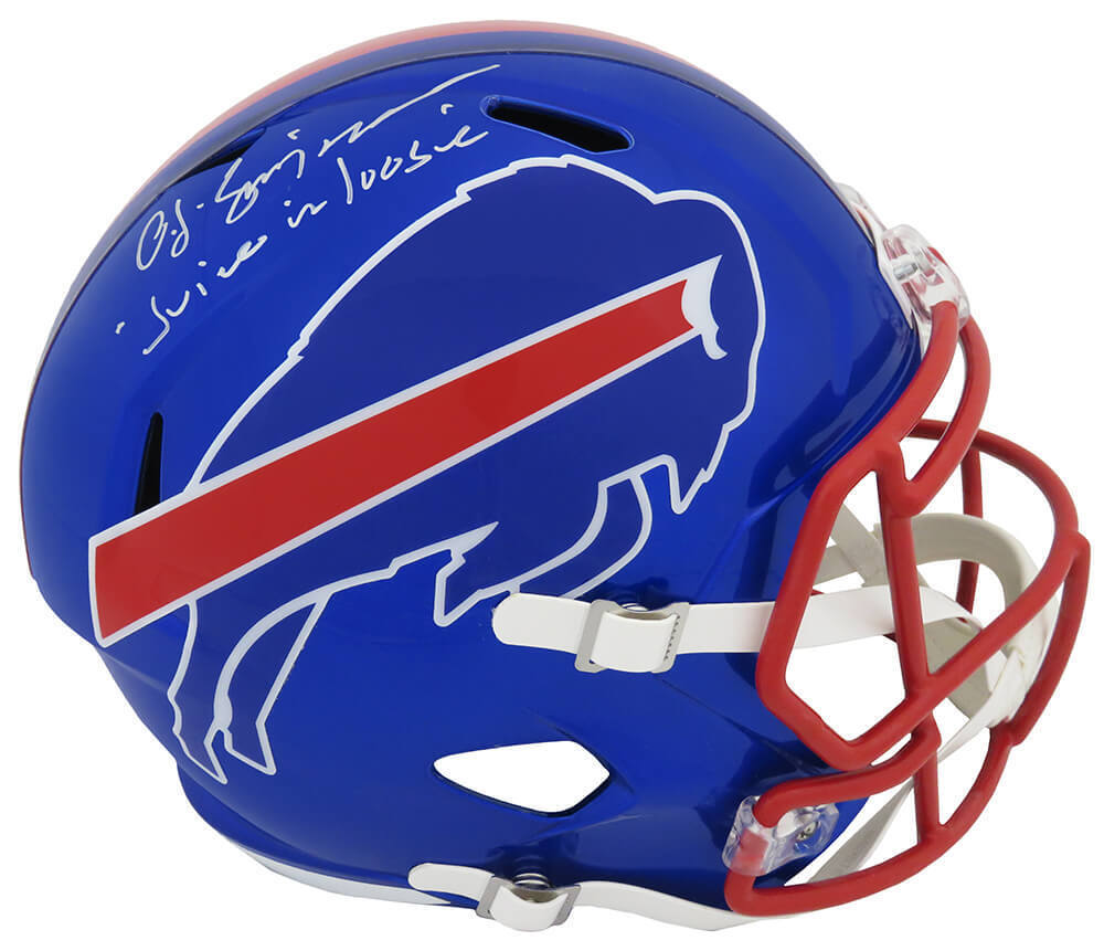 O.J. Simpson signed Buffalo Bills Flash Riddell full size speed replica helmet with 'Juice' inscription. Item comes with a Schwartz Sports Memorabilia tamper-proof numbered hologram and Certificate of Authenticity which can be verified online.