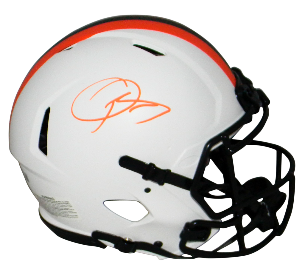Odell Beckham Jr, All-Pro wide receiver for the Cleveland Browns, has hand signed this Browns Riddell Speed Lunar full-size authentic helmet at a private signing. This helmet is fully padded inside like the ones worn the field. This item is authenticated by Beckett Authentication Services and was signed in the presence of one of their representatives. Their tamper-evident hologram featuring a QR code and serial number is on the item. The authenticity can be verified online by entering the serial number or scanning the QR code.Item pictured may not be the exact item you will receive. It will be similar quality, and we guarantee your satisfaction.