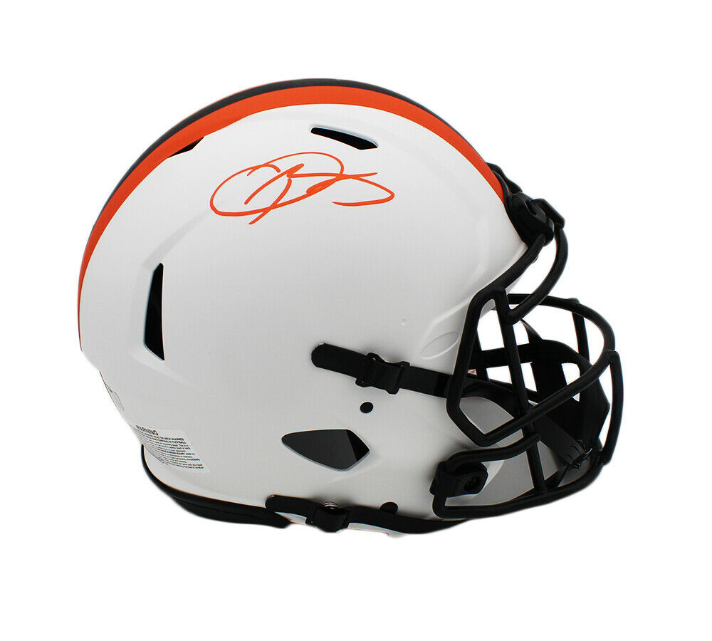 A Cleveland Browns Speed Authentic Lunar NFL Helmet hand signed by Odell Beckham Jr. The item and signature are in excellent condition. Odell is a wide receiver for the Cleveland Browns. He played college football at LSU before being drafted by the New York Giants in the first round of the 2014 NFL Draft. He was drafted 12th overall that year. Odell was the 2014 Offensive Rookie of the Year, and is a 3x Pro Bowler. AUTHENTICATION: The item is accompanied by a Certificate of Authenticity - Serial Numbered and Databased Hologram - Picture of Odell from the Signing