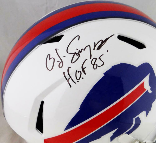 OJ Simpson Autographed Bills Full Size Speed Helmet W/ HOF - JSA W Auth This is a hand autograph of OJ Simpson of the Buffalo Bills on a Riddell Football Speed Full Size Replica Helmet and inscribed with "HOF." This item has a James Spence Witness Protection Authentication, which comes with a JSA numbered sticker and a matching JSA Certificate of Authenticity. You can view this item on the SpenceLOA website, it shows when and where the item was signed. It was signed either at a public autograph appearance or a private signing. This is a stock photo of the item. Although you may not receive this exact item, the item you receive is virtually identical and brand new in great shape.