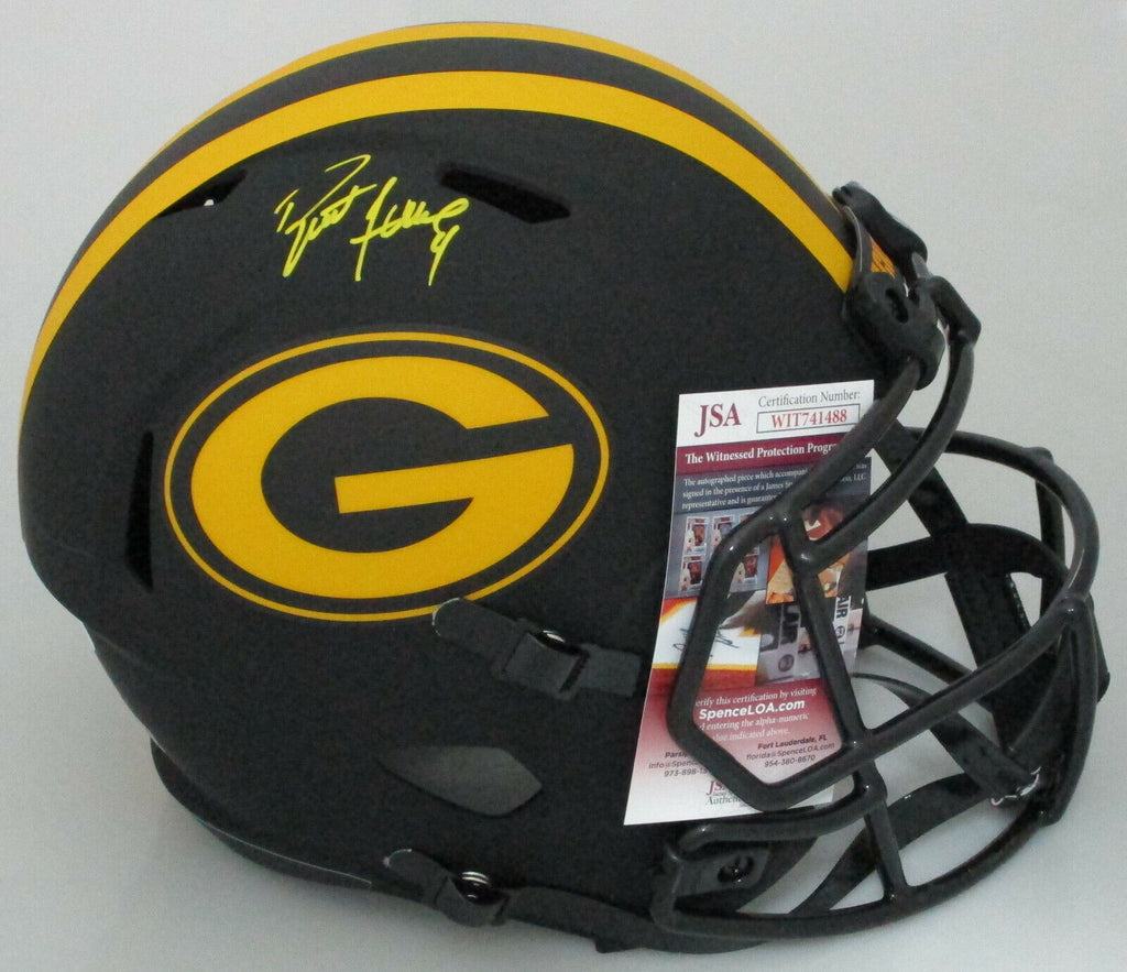 Green Bay Packers Full Size ECLIPSE Replica Speed Helmet hand signed by Green Bay Packer legend and Hall of Famer BRETT FAVRE. The signature is in Yellow paint pen. FAVRE was a member of the PACKERS SUPER BOWL XXXI Championship Team and is a 3 x NFL MVP!. This item was signed at a private signing and would make a great addition to any PACKERS collection! This item is guaranteed to be 100% authentic and will include a Brett Favre (Radtke Sports) tamper proof serial numbered hologram as well as JSA authentication.