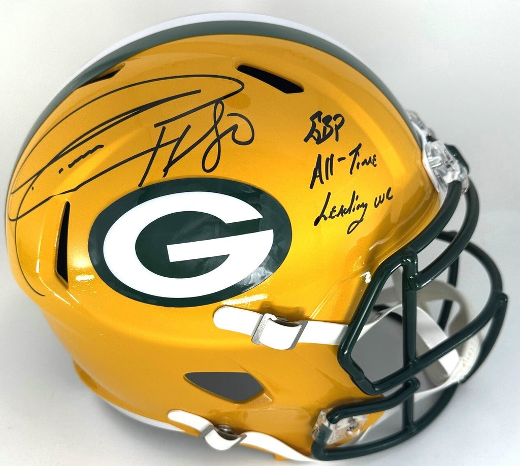 Riddell Full Size Replica Speed Helmet hand signed by Green Bay Packers Receiver DONALD DRIVER. The signature is in Black Paint Pen with the inscription "GBP All Time Leading WR". This would make a great addition to any Packers collection.This item was signed at a private signing with us. This item is guaranteed to be 100% authentic and will include a COA from JSA authentication.
