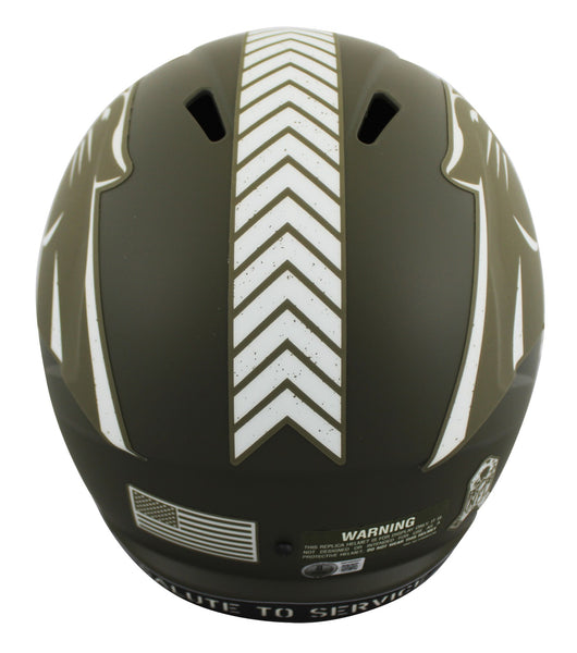 This Autographed Alternate Salute To Service Full Size Speed Rep Helmet W/ Uv Mirrored Back Acrylic Display Case has been Personally Signed by Julius Peppers of the Carolina Panthers. This item is 100% Authentic to include a hologram by Beckett Authentication Services. This item will come with an affixed Beckett Authentication Services (BAS) authentication sticker, which includes a scannable QR code to verify authenticity. Please note that Beckett no longer provides serial-numbered COA cards, and the attached BAS sticker will serve as the complete authentication for this item. This is a BAS Witnessed Protection Program item which means a Beckett Authentication Service representative was present when this item was being signed. We conducted an autograph signing with Julius Peppers where multiples of the same item were signed. While the photographs are representative of this item, the size, placement and strength of the signature may vary. Each item is hand signed, therefore, each autograph is unique. This item can be verified through BAS Witnessed.