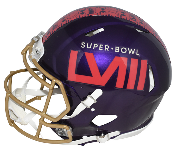 Patrick Mahomes and Andy Reid have each hand signed this Super Bowl LVIII Riddell Speed full-size authentic helmet at a private signing. This helmet is fully padded inside like the ones worn on the field. This item is authenticated by Beckett Authentication Services and was signed in the presence of one of their representatives. Their tamper-evident hologram featuring a QR code and serial number is on the item. The authenticity can be verified online by entering the serial number or scanning the QR code.Item pictured may not be the exact item you will receive. It will be similar quality, and we guarantee your satisfaction.