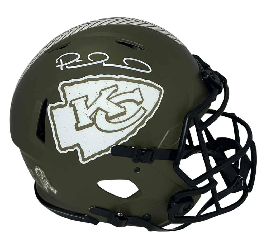 Patrick Mahomes, star quarterback for the Kansas City Chiefs, has hand signed this Chiefs Riddell Speed Salute to Service full-size authentic helmet at a private signing. This helmet is fully padded inside like the ones worn on the field. This item is authenticated by Beckett Authentication Services and was signed in the presence of one of their representatives. Their tamper-evident hologram featuring a QR code and serial number is on the item. The authenticity can be verified online by entering the serial number or scanning the QR code.Item pictured may not be the exact item you will receive. It will be similar quality, and we guarantee your satisfaction.