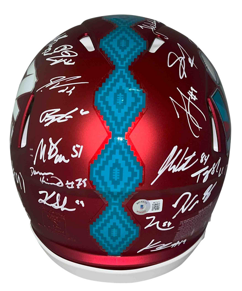 This Kansas City Chiefs Riddell Speed full-size replica helmet has been hand signed by 26 members of the of Super Bowl LVII championship team; Patrick Mahomes, Travis Kelce, Andy Reid, Nick Bolton, Willie Gay Jr, JuJu Smith-Schuster, Skyy Moore, Jerick McKinnon, Marquez Valdes-Scantling, Noah Gray, Justin Watson, Jody Fortson, Nick Allegretti, Derrick Nnadi, Trey Smith, Mike Danna, Jaylen Watson, Khalen Saunders, Juan Thornhill, Bryan Cook, L'Jarius Sneed, Leo Chenal, Tommy Townsend, James Winchester, Joshua Williams, and Darian Kinnard. This item is authenticated by Beckett Authentication Services and was signed in the presence of one of their representatives. Their tamper-evident hologram featuring a QR code and serial number is on the item. The authenticity can be verified online by entering the serial number or scanning the QR code.Item pictured may not be the exact item you will receive. It will be similar quality, and we guarantee your satisfaction.