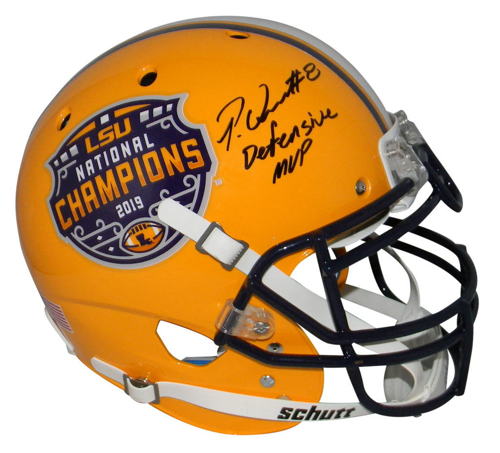 Patrick Queen, former All-American linebacker for the LSU Tigers, has hand signed this LSU Schutt full-size authentic helmet with the 2019 National Champions decal. He also included the inscription "Defensive MVP". This helmet is fully padded inside like the ones worn on the field. This item comes with a certificate of authenticity (COA) from Beckett Authentication Services and was signed in the presence of one of their representatives. You will receive a serial-numbered COA along with a matching serial-numbered sticker on the helmet. The authenticity can be verified online by entering the serial number.Item pictured may not be the exact item you will receive. It will be similar quality, and we guarantee your satisfaction.