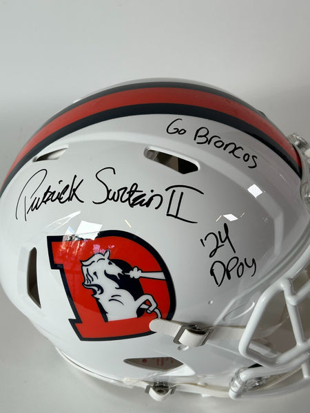 Elite Collectible: 2024 DPOY Commemorative Helmet Own an extraordinary piece of NFL history with this Patrick Surtain II Autographed Pro Snowcapped Helmet featuring dual premium inscriptions. This museum-quality collectible showcases Surtain's authentic signature alongside two powerful inscriptions: "24 DPOY" (2024 Defensive Player of the Year) and "Go Broncos" - making it one of the most sought-after pieces of Denver Broncos memorabilia available. Authenticated Excellence Beckett Authentication Services (BAS) Certificate of Authenticity included - guaranteeing 100% authenticity Hand-signed by Patrick Surtain II, elite NFL cornerback and Pro Bowl selection Dual inscriptions: "24 DPOY" and "Go Broncos" add exceptional value and rarity Official pro-style snowcapped helmet design Premium quality construction ready for display Investment-Grade Memorabilia This isn't just a collectible - it's a celebration of defensive dominance. The "24 DPOY" inscription commemorates Surtain's recognition as one of the league's premier defenders, while "Go Broncos" captures his dedication to Broncos Nation. With dual inscriptions and BAS authentication, this piece represents a rare opportunity for serious collectors. Perfect For: Serious sports memorabilia collectors and investors Denver Broncos superfans and season ticket holders Man cave centerpieces and office displays High-value gifts for milestone occasions Legacy pieces to pass down through generations Display-Ready Presentation This pro-quality helmet arrives ready to showcase as the crown jewel of your collection. The iconic snowcapped design combined with Surtain's bold signature and dual inscriptions creates an unforgettable statement piece that celebrates both individual excellence and team pride. Limited availability. As one of the NFL's rising defensive stars, Patrick Surtain II memorabilia with premium inscriptions like these are highly coveted and appreciate significantly over time.