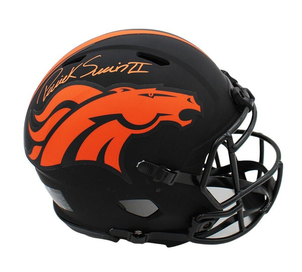 A Denver Broncos Speed Authentic Eclipse NFL Helmet hand signed by Patrick Surtain II. The item and signature are in excellent condition. Patrick Surtain II is an American football cornerback. He played college football at the University of Alabama, where he was recognized as one of the top defensive players in the nation. Surtain was selected by the Broncos in the second round of the 2021 NFL Draft. AUTHENTICATION: The item has been tagged with a SmarTag powered by Prova Technology, which gives you digital access to the items authentication records, including a proof picture from the signing.