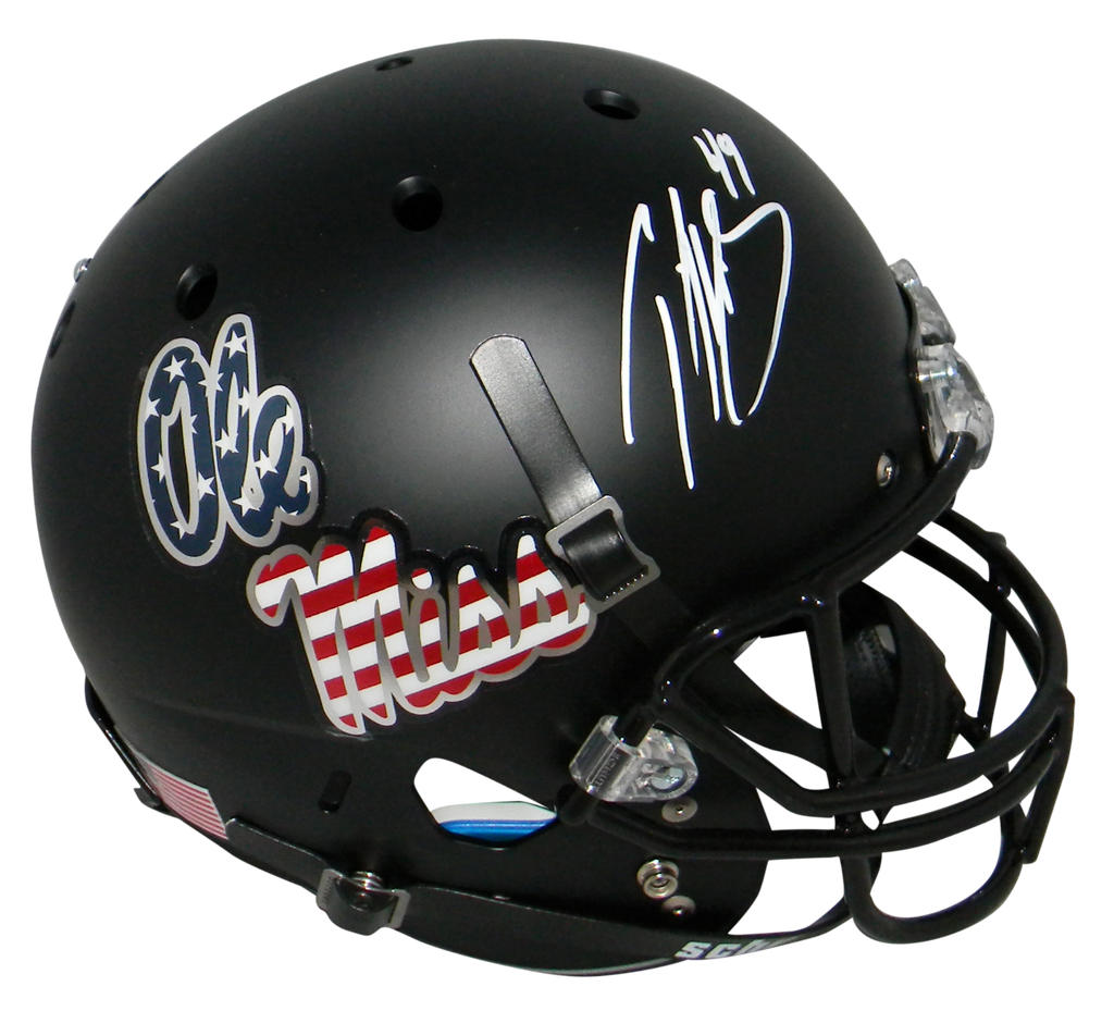 Patrick Willis, former All-American linebacker for the Rebels, has hand signed this matte black Ole Miss Schutt full-size replica helmet at a private signing. This item comes with a certificate of authenticity (COA) from Beckett Authentication Services and was signed in the presence of one of their representatives. You will receive a serial-numbered COA along with a matching serial-numbered sticker on the helmet. The authenticity can be verified online by entering the serial number.Item pictured may not be the exact item you will receive. It will be similar quality, and we guarantee your satisfaction.