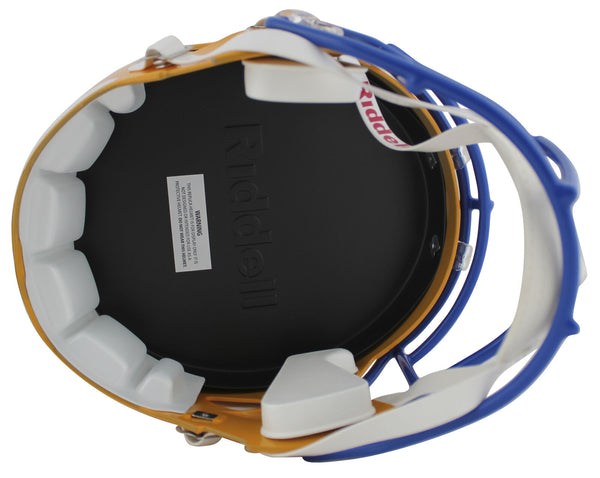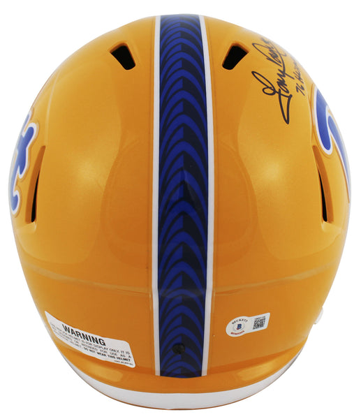 This Autographed Full Size Speed Rep Helmet with the inscription of "Heisman 76" has been Personally Signed by Tony Dorsett of the Pittsburgh Panthers. This item is 100% Authentic to include a hologram by Beckett Authentication Services. This item will come with an affixed Beckett Authentication Services (BAS) authentication sticker, which includes a scannable QR code to verify authenticity. Please note that Beckett no longer provides serial-numbered COA cards, and the attached BAS sticker will serve as the complete authentication for this item. This is a BAS Witnessed Protection Program item which means a Beckett Authentication Service representative was present when this item was being signed. We conducted an autograph signing with Tony Dorsett where multiples of the same item were signed. While the photographs are representative of this item, the size, placement and strength of the signature may vary. Each item is hand signed, therefore, each autograph is unique. This item can be verified through BAS Witnessed.
