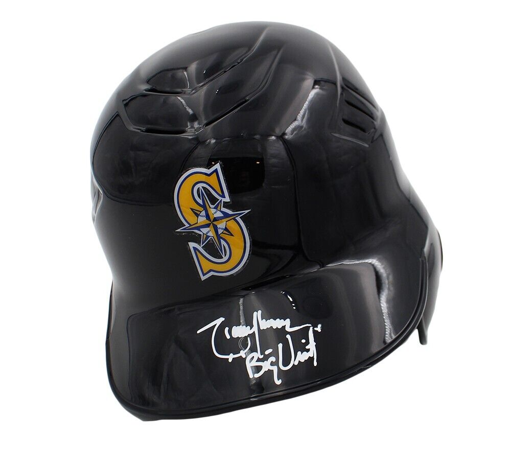 A Seattle Mariners Rawlings Mach Pro MLB Helmet hand signed by Randy Johnson. The item and signature are in excellent condition. In addition to signing his name, Randy also inscribed "Big Unit" on the item. Randy is a 10x All Star, 2001 World Series Champion and 2001 World Series MVP. AUTHENTICATION: The item is accompanied by an Beckett Serial Numbered and Databased Hologram.