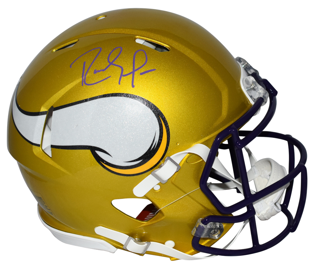 Randy Moss, former Hall of Fame wide receiver for the Minnesota Vikings, has hand signed this Vikings Riddell Speed Flash full-size authentic helmet at a private signing. This helmet is fully padded inside like the ones worn on the field. This item is authenticated by Beckett Authentication Services and was signed in the presence of one of their representatives. Their tamper-evident hologram featuring a QR code and serial number is on the item. The authenticity can be verified online by entering the serial number or scanning the QR code.Item pictured may not be the exact item you will receive. It will be similar quality, and we guarantee your satisfaction.
