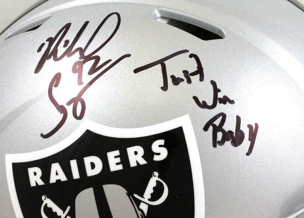 Richard Seymour Signed Raiders Authentic F/S Speed Helmet w/ Insc- Beckett W This is a Richard Seymour of the Oakland Raiders hand autographed Riddell Football Authentic Full Size Speed Helmet inscribed with "Just Win Baby". This item has a Beckett Witnessed Authentication, which comes with a Beckett numbered sticker and a matching Certificate of Authenticity. You can view this item on the Beckett website, it shows when and where the item was signed. It was signed either at a public autograph appearance or a private signing. This is a stock photo of the item. Although you may not receive this exact item, the item you receive is virtually identical, brand new, and in great shape.