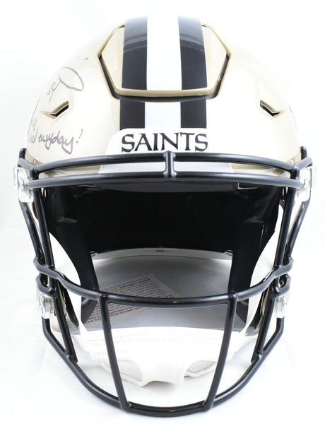 This is a Ricky Williams of the New Orleans Saints Autographed Riddell football full size Speed Flex Authentic helmet. Inscribed Smoke Weed Everyday. This item has a Beckett Witnessed Authentication, which comes with a numbered hologram and a QR code for verification. You can view this item on the Beckett Authentication website and it shows when and where the item was signed. It was signed either at a public autograph appearance or a private signing. This is a stock photo of the item. Although you may not receive this exact item, the item you receive is virtually identical, brand new, and in great shape. *Autograph location may vary* This is a Ricky Williams of the New Orleans Saints Autographed Riddell football full size Speed Flex Authentic helmet. Inscribed Smoke Weed Everyday. This item has a Beckett Witnessed Authentication, which comes with a numbered hologram and a QR code for verification. You can view this item on the Beckett Authentication website and it shows when and where the item was signed. It was signed either at a public autograph appearance or a private signing. This is a stock photo of the item. Although you may not receive this exact item, the item you receive is virtually identical, brand new, and in great shape. *Autograph location may vary*