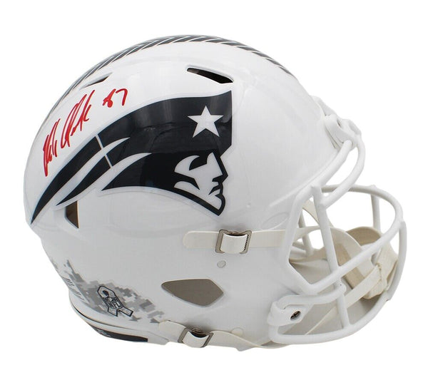A New England Patriots Speed Authentic Salute to Service 3 NFL Helmet hand signed by Rob Gronkowski. The item and signature are in excellent condition. Rob is a 5x All-Pro First Team, 5x Pro Bowler, and 2x Super Bowl Champion. AUTHENTICATION: Your item is tagged with a Rob Gronkowski exclusive SmarTag powered by Prova Technology, which gives you digital access to your items authentication records, which includes a proof picture from the signing.