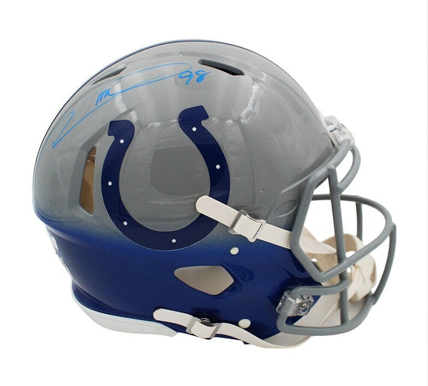 An Indianapolis Colts Speed Authentic Custom Gray/Blue Fade NFL Helmet Hand Signed by Robert Mathis. The signatures and item are in excellent condition. Robert is a former outside linebacker who spent his entire 14-year career with the Indianapolis Colts of the NFL. He played college football at Alabama A&M and was drafted by the Colts in the fifth round of the 2003 NFL Draft. A five-time Pro Bowler, Mathis won Super Bowl XLI with the Colts in 2006 over the Chicago Bears. AUTHENTICATION: The item is accompanied by a Certificate of Authenticity - Serial Numbered and Databased Hologram - Picture of Robert from the signing