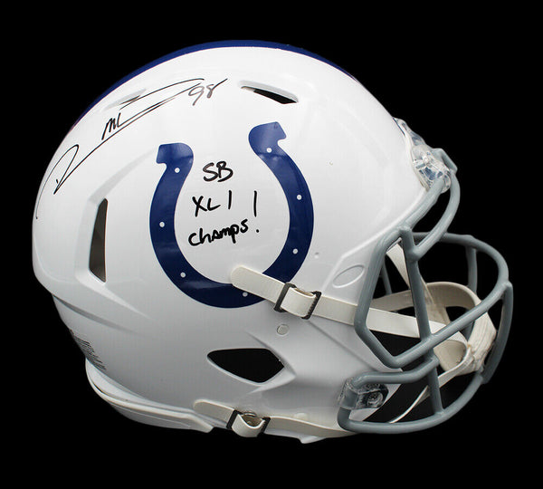 An Indianapolis Colts Speed Authentic NFL Helmet Hand Signed by Robert Mathis. The signatures and item are in excellent condition. In addition to signing his name, Robert also inscribed "SB XLI Champs!" on the item. Robert is a former outside linebacker who spent his entire 14-year career with the Indianapolis Colts of the NFL. He played college football at Alabama A&M and was drafted by the Colts in the fifth round of the 2003 NFL Draft. A five-time Pro Bowler, Mathis won Super Bowl XLI with the Colts in 2006 over the Chicago Bears. AUTHENTICATION: The item is accompanied by a Certificate of Authenticity & Hologram - Serial Numbered and Databased Hologram - Picture of Robert from the signing